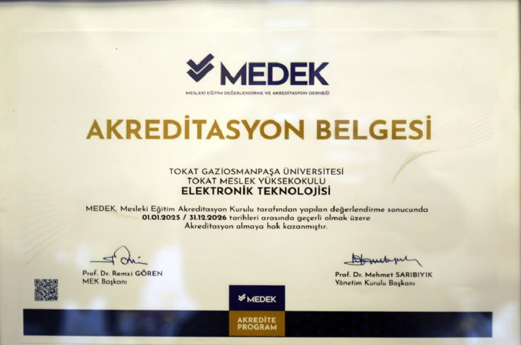 Rektörümüz Prof. Dr. Fatih Yılmaz yapmış olduğu konuşmada hem kurumsal akreditasyonun hem de bölüm ve programlarımızın akredite edilmesinin önemine vurgu yaptı. Üniversite olarak kurumsal akreditasyon süreçlerinin devam ettiğini vurgulayan Rektörümüz akredite olan bölüm ve program sayısını da artırmayı hedeflediklerini ifade etti. Yakın bir zaman içerisinde Tokat Meslek Yüksekokulu “Elektronik Teknolojisi” programımızın akredite edildiğini belirten Rektörümüz süreçte emeği geçen akademik personelimize teşekkür etti. Akabinde MEDEK tarafından verilen akreditasyon belgesi Rektörümüze takdim edildi.